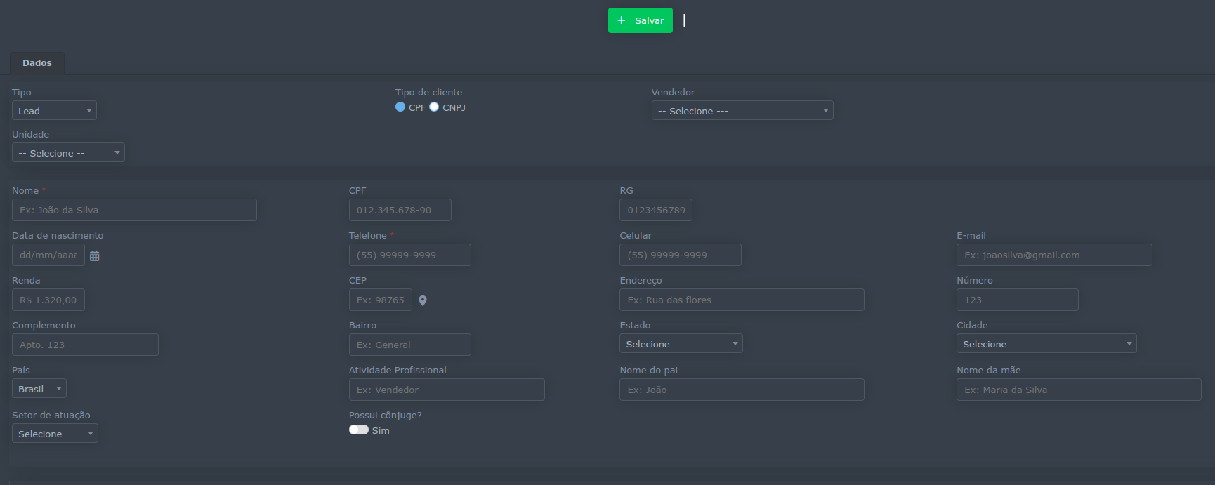 neles serão inseridas as informações do cliente para cadastro. Dados obrigatórios possuem uma