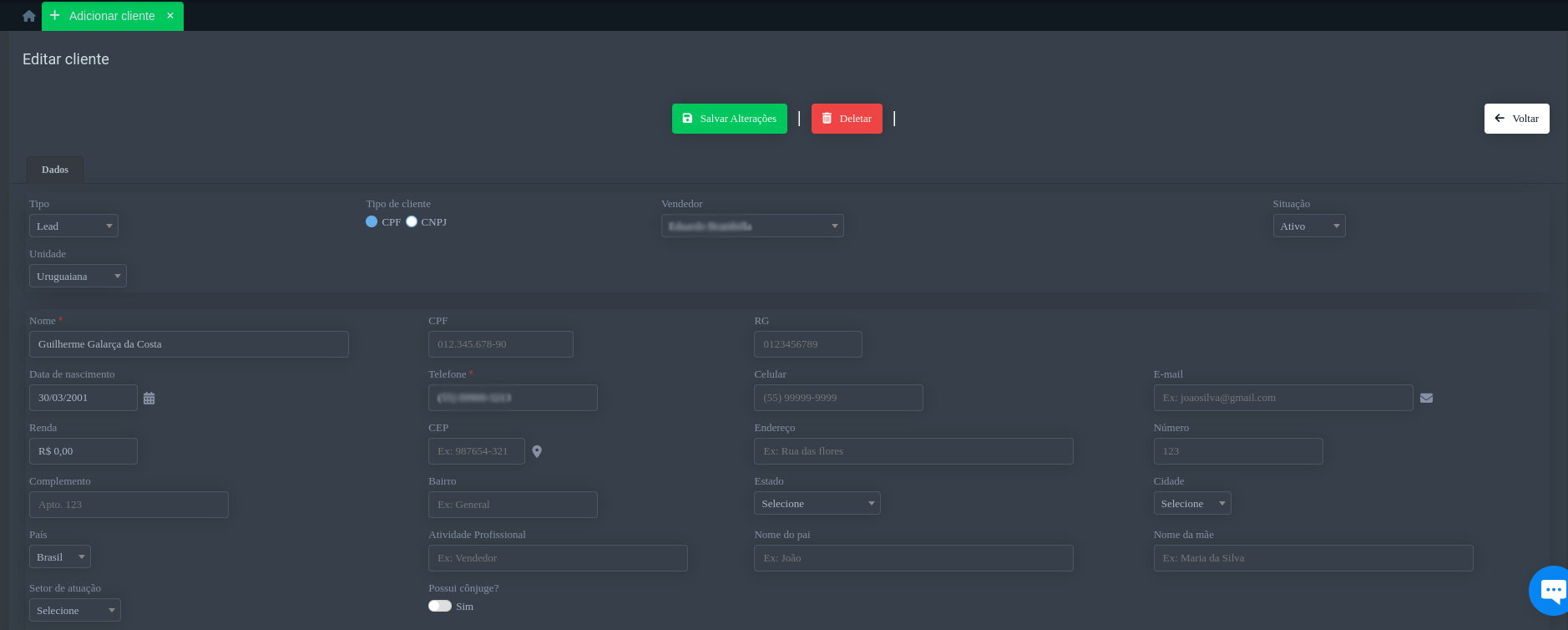 Após inseridos os dados do cliente devemos clicar no botão de Salvar no topo do formulário.