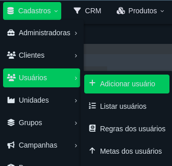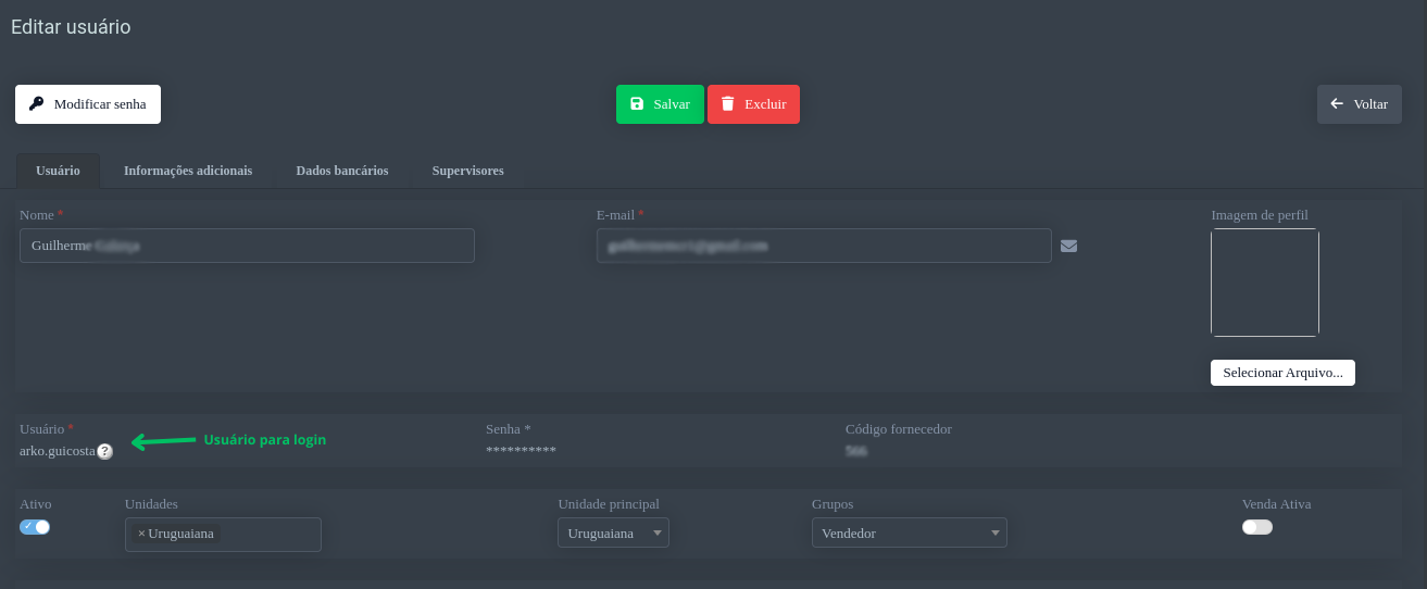 - No campo Grupos é possível definir o grupo do usuáro, como Vendedor, Gestor, Administrador.