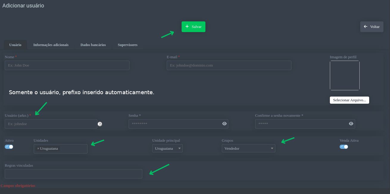 - Neste campo deve ser observad o prefixo exibido, no exemplo é possível ver que antes do usuário cadastrado foi inserido o prefixo