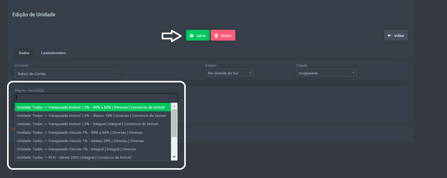 Agora devemos procurar na lista de regras disponíveis a regra que criamos, na imagem abaixo temos um exemplo de como deve ficar primeiramente escolher a regra vinculada, após selecionarmos todas que vão ser designadas para a unidade apertamos em